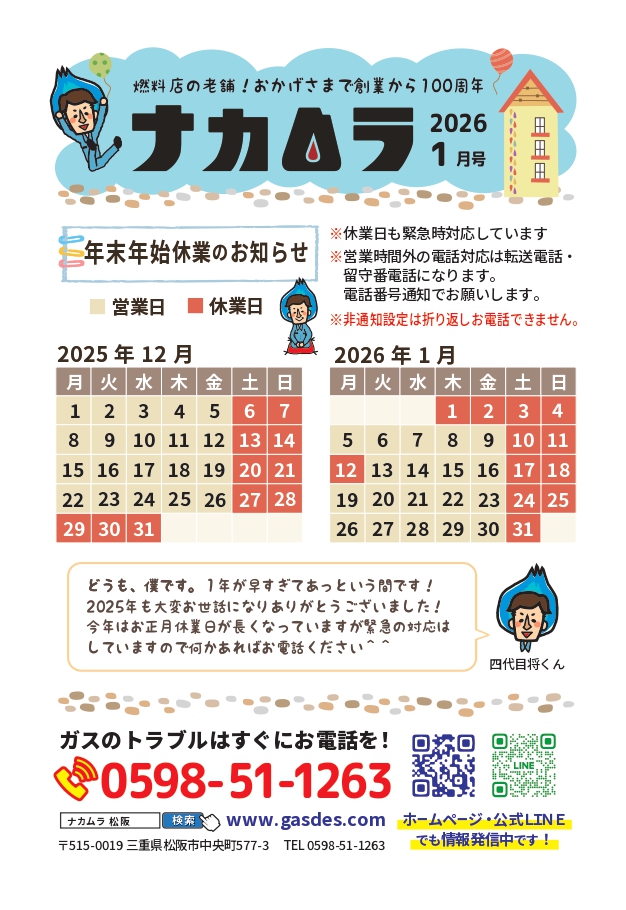 休業期間中も、緊急の対応をさせていただきますのでガスが出ない等あればお電話ください